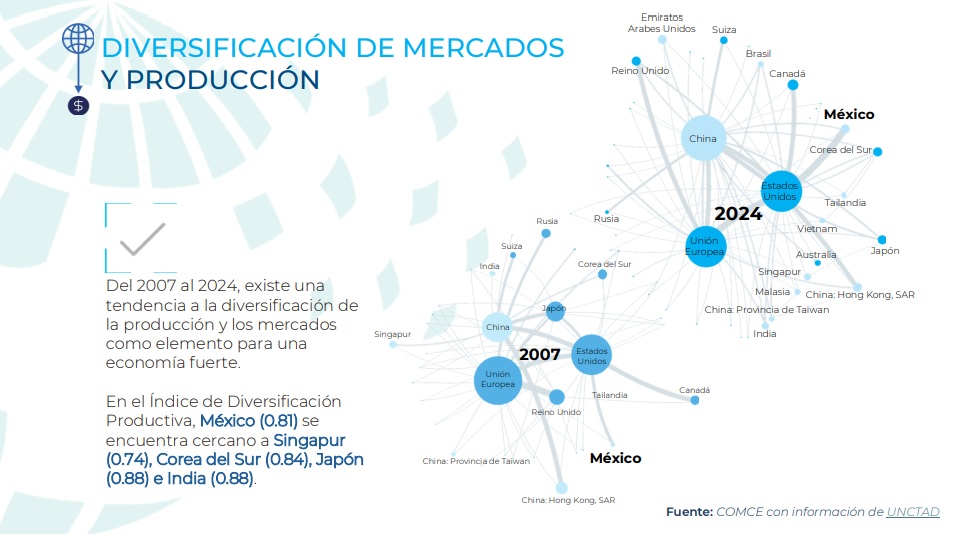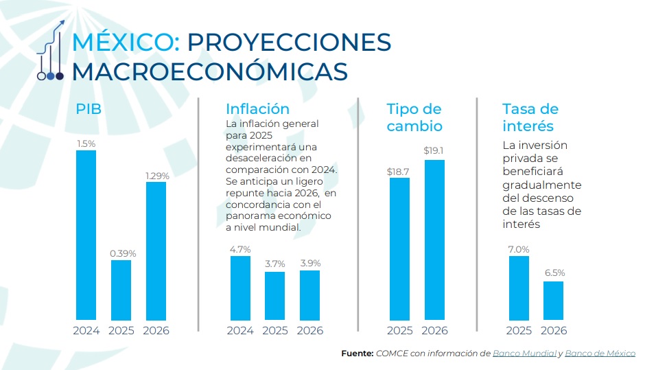 CIUDAD DE MÉXICO (08/12/2025).- El Consejo Empresarial Mexicano de Comercio Exterior, Inversión y Tecnología (COMCE) presentó un balance de la economía mexicana que confirma su crecimiento pese a la desaceleración global. México cerrará 2025 con 660 mil millones de dólares en exportaciones y se proyecta superar los 700 mil millones en 2026. La economía mantiene su posición como 13ª a nivel mundial, décimo exportador global y quinto receptor de inversión extranjera directa, con un récord de 40,906 millones de dólares este año. Para 2026 se prevé un crecimiento del 1.29% al 1.5%, inflación de 3.7% y un tipo de cambio cercano a 19 pesos por dólar, consolidando al país como una de las economías que avanza mientras el mundo se desacelera.