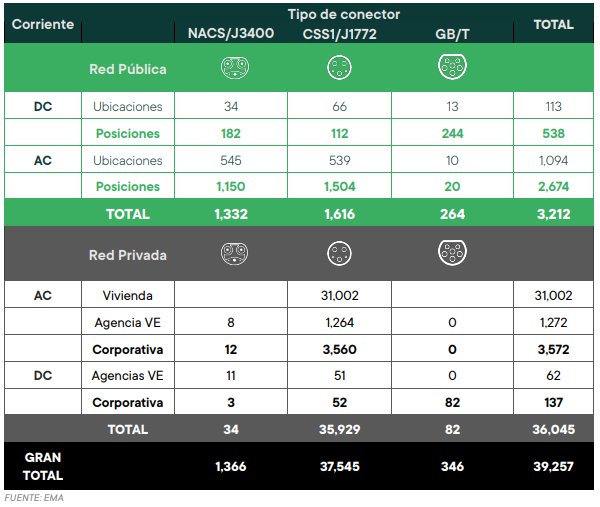 Para ambas estadísticas, pública y privada, son considerados los principales tipos de conectores instalados en el mercado: NACS-J3400, CSS1-J1772 y GB/T.