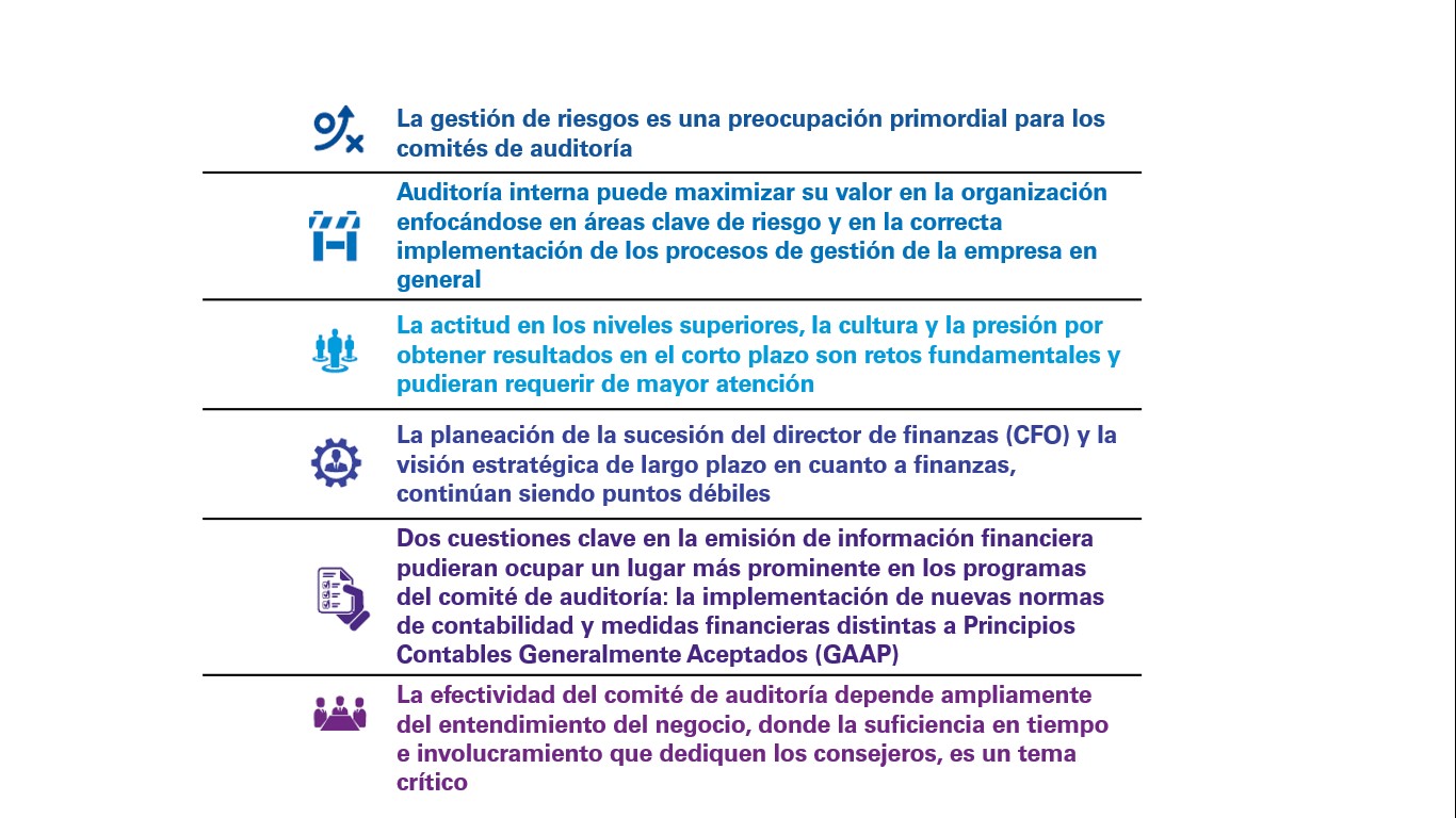 Si bien los comités de auditoría se muestran confiados en los reportes financieros y en la calidad de la auditoría, dentro de los aspectos del negocio que tienen más retos se mencionan: cumplimiento regulatorio y legal (34%), riesgo cibernético (28%), mantenimiento de controles de riesgo en la empresa (28%), y la actitud de los niveles gerenciales y la cultura organizacional (24%).
