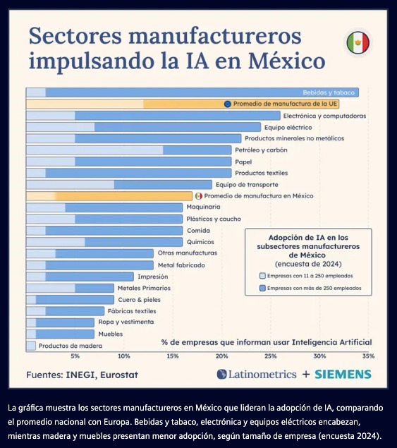 Si bien México todavía está en una etapa temprana, estas métricas sirven como referencia del potencial que puede alcanzarse al integrar IA de forma más amplia, desde control de calidad automatizado hasta mantenimiento predictivo y optimización de procesos.