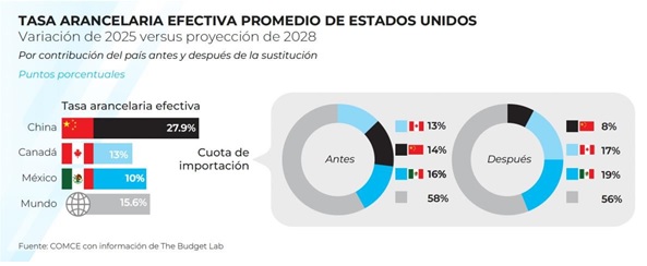 De acuerdo con datos del Buró de Censo de Estados Unidos, México representó el 16.4% de las importaciones estadounidenses en junio de 2025. Según estimaciones de COMCE basadas en el Laboratorio de Presupuesto de Yale, este porcentaje podría aumentar hasta 19% en un plazo de tres años, lo que significa que 1 de cada 5 importaciones de EU podría provenir de México.