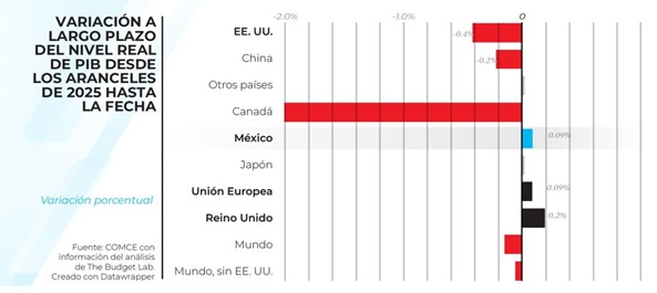En contraste, Canadá registra la mayor afectación con una contracción de -2.5% a largo plazo, mientras que la economía china disminuiría en -0.2%.