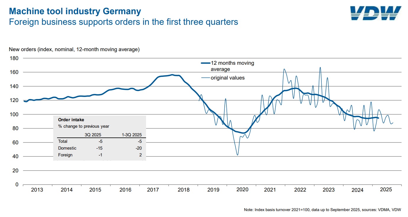 FRÁNCFORT DEL MENO, Alemania (19/11/2025).- La industria alemana de máquinas herramienta continúa enfrentando un entorno complejo: los pedidos cayeron un 5% en el tercer trimestre de 2025, con un desplome del 15% en la demanda nacional y una ligera baja del 1% en los pedidos del extranjero. El mismo retroceso del 5% se observó en el acumulado de enero a septiembre, periodo en el que la demanda interna se contrajo un 20%, mientras que los pedidos internacionales se mantuvieron un 2% por encima del año anterior.